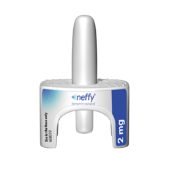The FDA approved the neffy epinephrine spray for adults and children over 66 pounds. It is administered as one 2-milligram spray in a nostril. Each neffy package has two epinephrine nasal sprayers. In a reaction that’s not resolving quickly, the second spray can be administered into the same nostril.